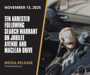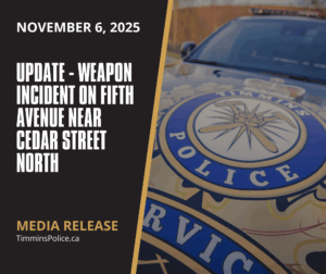 UPDATE – November 6th, 2025 (TIMMINS) The Timmins Police Service’s Criminal Investigation Division continues to investigate the weapons incident that occurred in the area of