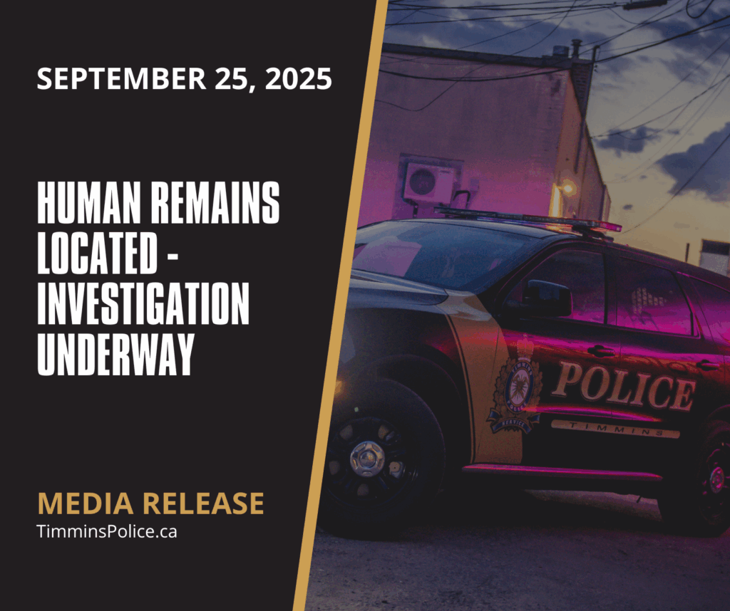 (TIMMINS) – On September 22, 2025, at approximately 1:21 p.m., the Timmins Police Service received a call regarding the discovery of human remains in a wooded area off Riverside Drive.