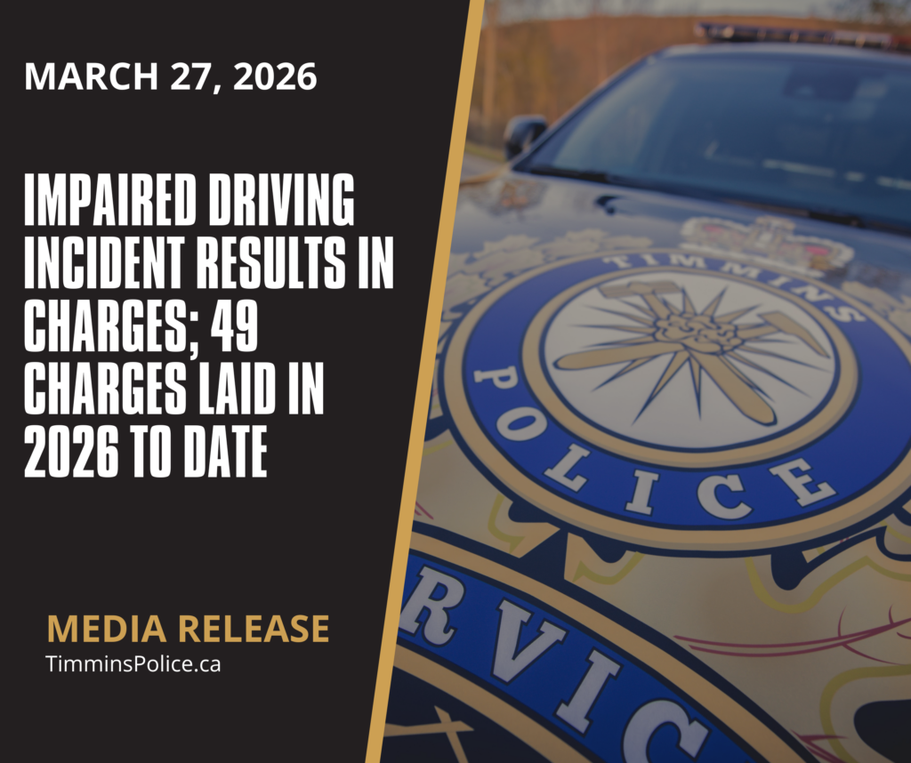Since January 2026, the Timmins Police Service has responded to 15 impaired driving-related incidents, resulting in a total of 49 charges. These incidents include 9 drug-related impairments and 6 alcohol-related impairments.
