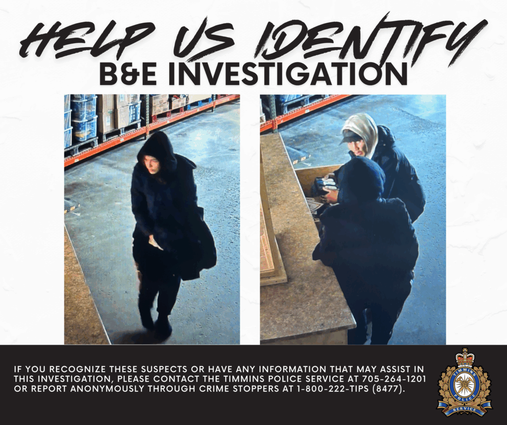 If you recognize the suspects or have any information that may assist investigators, please contact the Timmins Police Service at 705-264-1201.