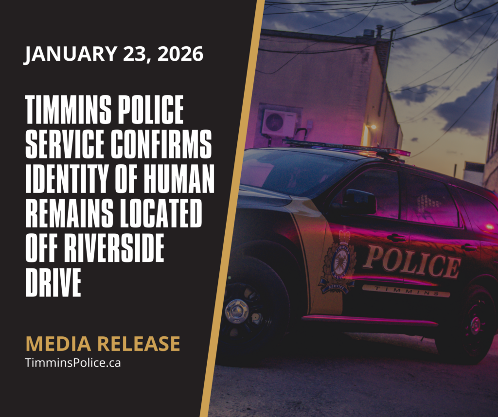 On September 22, 2025, at approximately 1:21 p.m., Timmins Police Service received a call reporting the discovery of human remains in a wooded area off Riverside Drive. Members of the Timmins Police Service attended the scene and initiated an investigation in coordination with the coroner’s office, forensic anthropologist and the OPP Canine Unit.