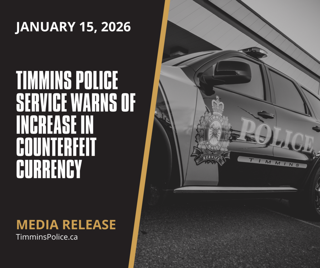 (TIMMINS) The Timmins Police Service is advising the public, local businesses, and financial institutions of a significant increase in the use and circulation of counterfeit Canadian currency within the City of Timmins over the past two months.